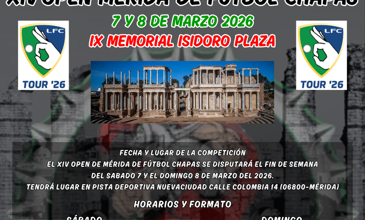 La XIV edición del Circuito de Opens de la Federación Española de Fútbolchapas 'Ciudad de Mérida', que se celebrará en la capital extremeña este fin de semana, 7 y 8 de marzo, y que también rendirá homenaje en su IX Memorial a 'Isidoro Plaza', reunirá a 80 jugadores de toda la geografía española y contará con la visita de varios participantes portugueses.