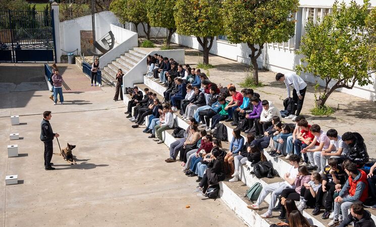 El alumnado del centro pudo asistir a una exhibición del desempeño de esta Unidad Canina que trabaja en controles de alcoholemia y drogas.
