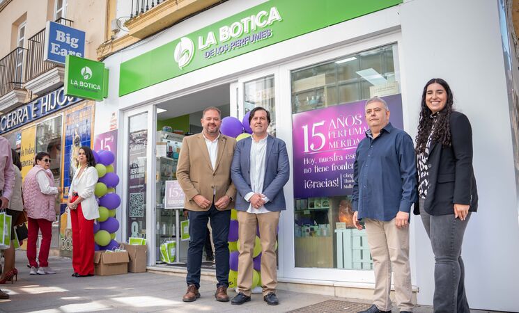 El alcalde de Mérida, Antonio Rodríguez Osuna, junto a la delegada de Comercio y Emprendimiento, Laura Iglesias, ha visitado este miércoles el negocio emeritense 'La Botica de los Perfumes' con motivo de la celebración de su 15º aniversario.