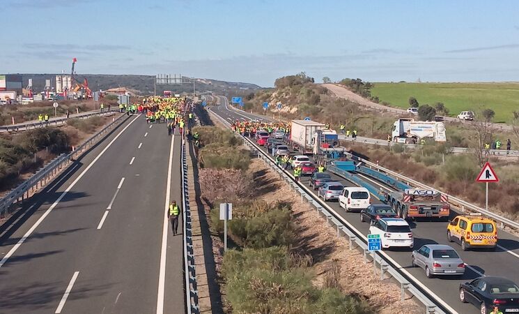Varios centenares de agricultores participan en el corte de la autovía A-5 a la altura de la localidad cacereña de Navalmoral de la Mata, una de las más multitudinarias de la jornada, y que ha permanecido cortada al tráfico durante más de una hora.