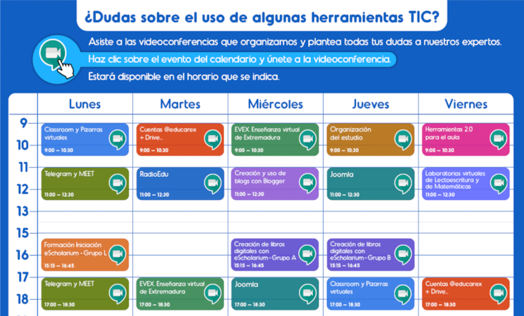 La actividad más reciente, que se ha puesto en marcha esta misma semana, consiste en una serie de videoconferencias en las que los docentes interesados pueden inscribirse desde una página del portal educativo Educarex https://www.educarex.es/info-coronavirus/atencion-online.html, de acuerdo con un calendario semanal.