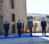 Sobre una tarima instalada frente al Museo Arqueológico, situado en la Alcazaba de Badajoz, los cuatro se han quitado las mascarillas para escuchar los himnos nacionales, interpretado por un cuarteto de cuerda de la Orquesta de Extremadura.