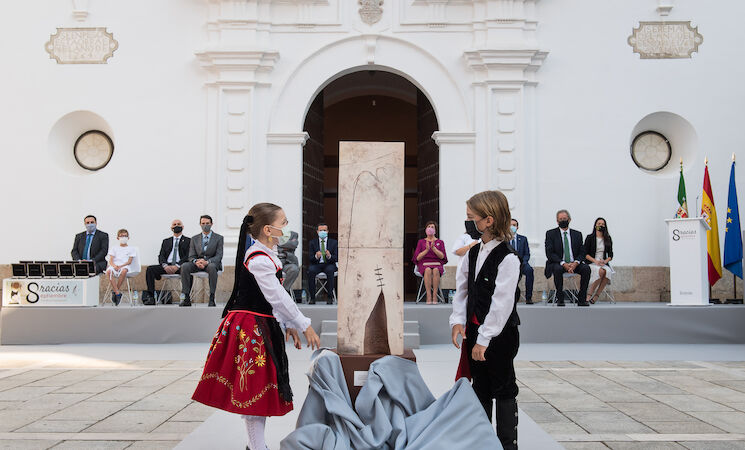 Posteriormente, se ha procedido al descubrimiento de un monolito en recuerdo de los más de 500 fallecidos a causa de la Covid-19 y de sus familias, por parte de los pequeños Carla y Rodrigo, vestidos con el traje regional de Mérida.