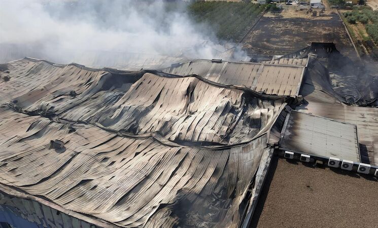 El incendio se ha dado por controlado y estabilizado la pasada madrugada. Durante toda la mañana continúan las labores del CPEI se han centrado en refrescar la zona en un incendio que ha devastado por completo las instalaciones frutícolas.