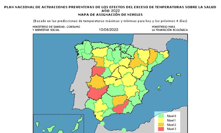 Así, cuando se prevea que las temperaturas van a sobrepasar esos niveles de referencia durante uno o dos días, se asignará el nivel 1 o de bajo riesgo, representado con el color amarillo; si la previsión señala que la situación durará tres o cuatro días, se establecerá el nivel 2 o de riesgo medio, representado con el color naranja; en caso de que se prevean cinco días de temperaturas superiores a las de referencia, se asignará el nivel 3 o de alto riesgo, representado con el color rojo.