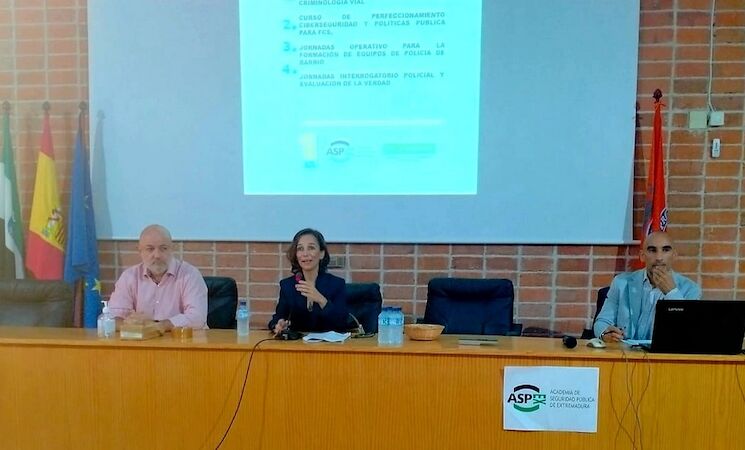 La directora general de Emergencias, Protección Civil e Interior de la Junta de Extremadura, Nieves Villar, ha intervenido este martes en Badajoz en el acto de inauguración de los cursos de criminología vial, ciberseguridad y políticas de seguridad que se imparten en la Academia de Seguridad Pública de la comunidad (Aspex), en colaboración con la Universidad de Extremadura (UEx) a agentes de Policía Local.