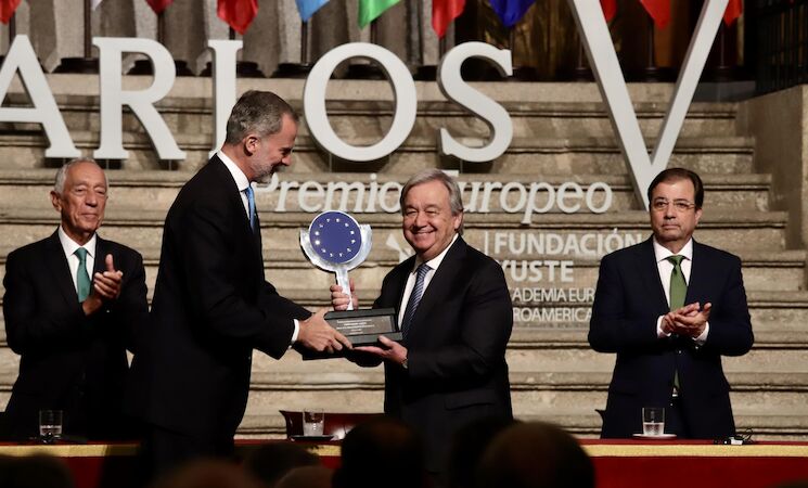 Por último, y en portugués, Felipe VI ha dado la enhorabuena a António Guterres por el Premio Europeo Carlos V, por su carrera profesional y por "su compromiso vital ejemplar al servicio de todos".