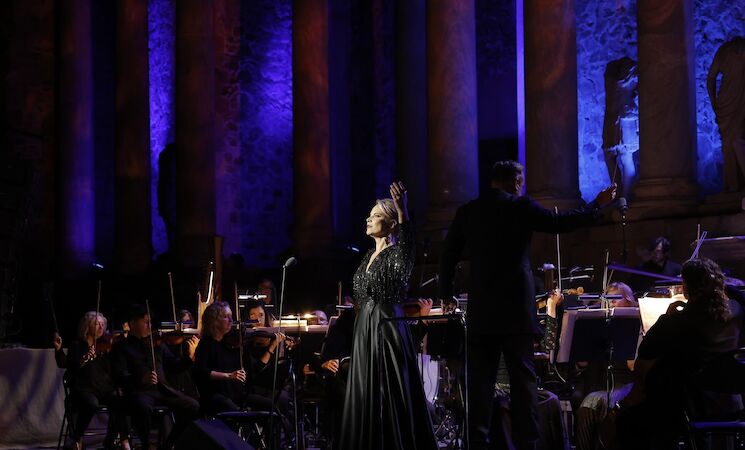 El programa siguió con varias piezas de zarzuela y terminó con Garanca interpretando 'Carceleras', de 'Las Hijas de Zebedeo', seguido de una 'propina' que encandiló al público y con la que se cerró una noche de lírica y magia en el Teatro Romano de Mérida.