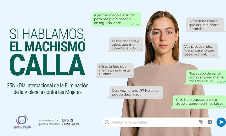 "Si hablamos, el machismo calla" es el lema elegido por la Junta de Extremadura para desarrollar una campaña de sensibilización con motivo del Día Internacional de la Eliminación de la Violencia Contra las Mujeres, que se conmemora el 25 de noviembre.