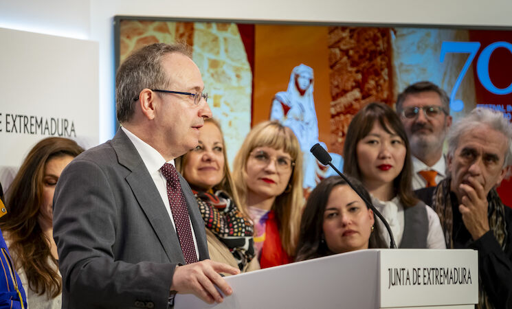 La 70ª edición del Festival Internacional de Teatro de Mérida ha sido presentada oficialmente esta mañana en la sede de Presidencia de la Junta de Extremadura por la presidenta de la institución, María Guardiola, y por el director del Festival, Jesús Cimarro.
