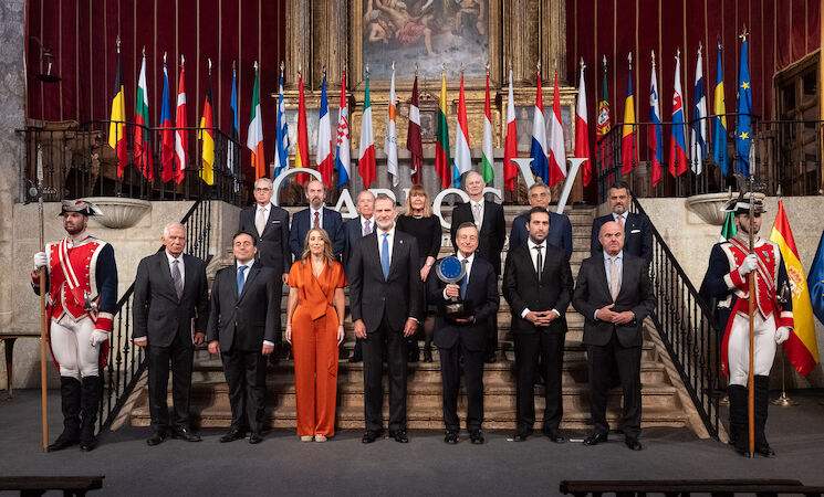 De este modo se ha pronunciado Su Majestad durante su discurso en la ceremonia de entrega del Premio Carlos V al expresidente del Banco Central Europeo (BCE) y del Consejo de Ministros de la República de Italia, Mario Draghi, celebrada en el Monasterio de San Jerónimo de Yuste, en Cuacos de Yuste (Cáceres).