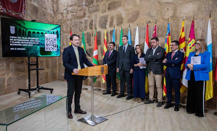 El consejero de Presidencia, Interior y Diálogo Social, Abel Bautista, ha firmado junto a los agentes sociales y económicos el nuevo Plan de Empleo de Extremadura 2024-2025 y cuatro Planes Estratégicos de Economía 2024-2027, junto al consejero de Economía, Empleo y Transformación Digital, Guillermo Santamaría; el secretario general de Economía, Empresa y Comercio, Víctor Píriz; la secretaria general de Empleo, María José Nevado; el secretario general del Servicio Extremeño Público de Empleo (Sexpe), Nicolás Macías; el director general de Empleo, Pedro Galán, y la directora general de Formación para el Empleo, Teresa Morales.
