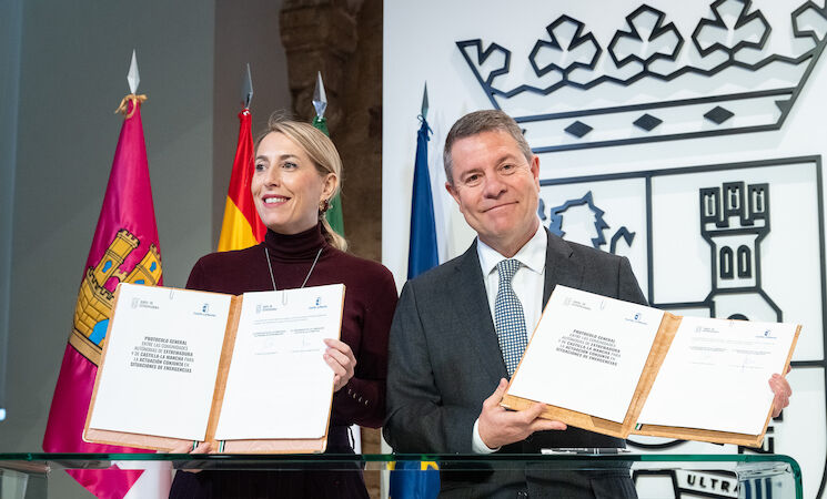Por otro lado, Guardiola y Page también han firmado el primer Protocolo General de Actuación en Emergencias entre ambas comunidades. La jefa del Ejecutivo extremeño ha explicado que este acuerdo recoge, en primer lugar, un protocolo de coordinación de los centros 112 de ambas comunidades y que va a permitir tener "geolocalizados los recursos más cercanos" en las zonas limítrofes de las dos regiones para conseguir una gestión de la emergencia "de una manera eficaz y que el tiempo de respuesta sea lo más corto posible porque cada segundo cuenta".