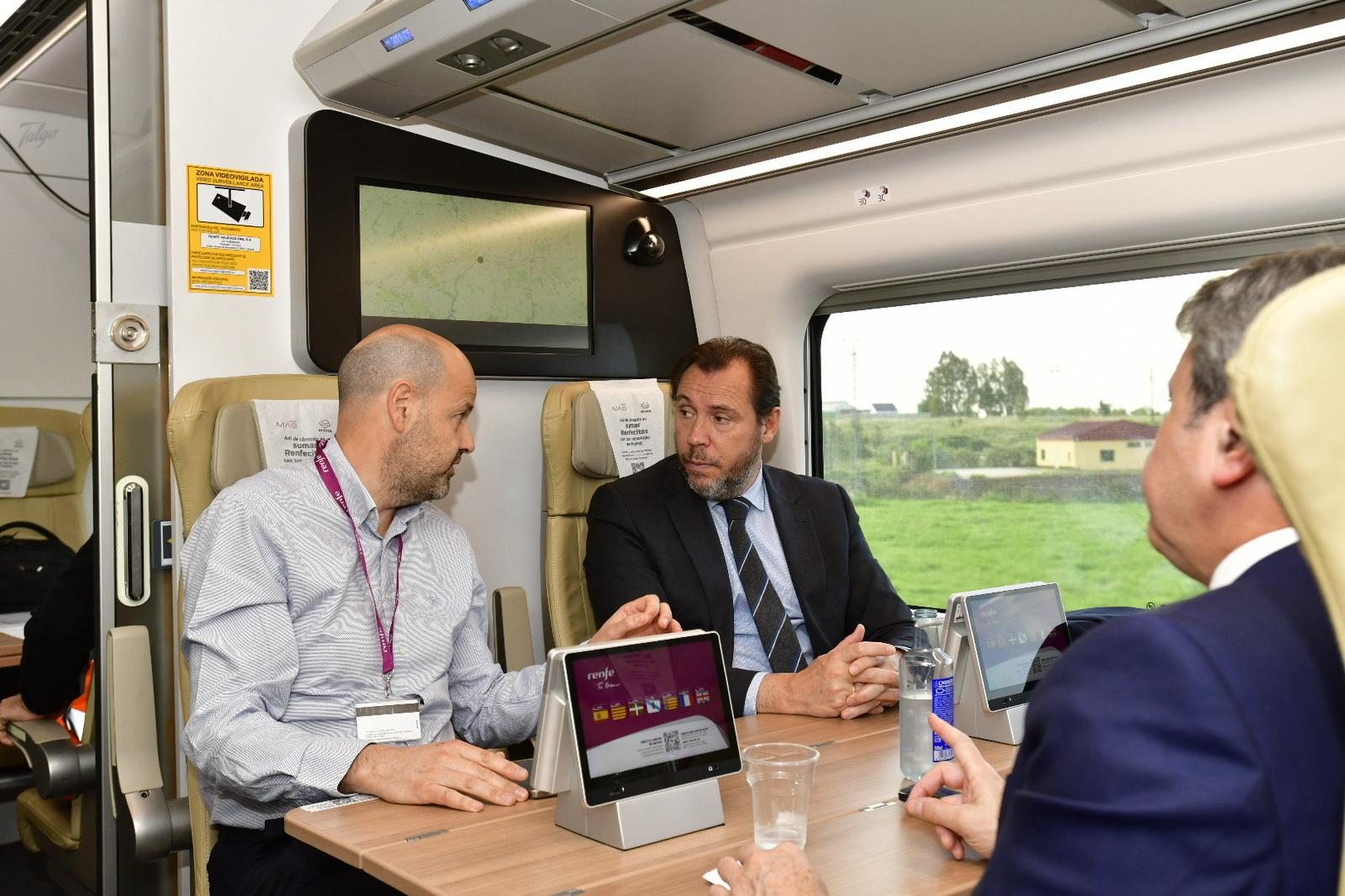 El ministro de Transportes y Movilidad Sostenible, Óscar Puente, ha viajado este lunes entre Badajoz y Plasencia en el tren S106 para conocer de primera mano cómo se realizan las pruebas del moderno sistema de señalización y seguridad ERTMS, que permitirá viajar a 300 km/h por Extremadura.