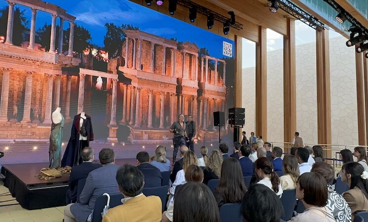Tras la intervención de la presidenta, María Guardiola, que ha puesto de relieve los recursos culturales y turísticos de la comunidad, entre otros, los invitados y visitantes del Pabellón de España han podido disfrutar de un fragmento de la obra Tito Andrónico, estrenada en el seno del Festival, en 2019, interpretado por los actores José Vicente Moirón y Gabriel Moreno, de la compañía Teatro del Noctámbulo.