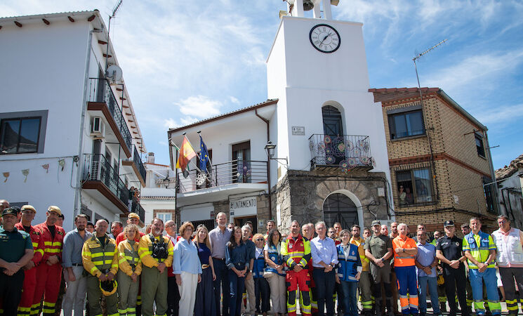 En la localidad cacereña, han estado casi una hora saludando a los vecinos de esta localidad, la primera que fue evacuada junto a Jarilla y Villar de Plasencia, el martes 12 de agosto, así como a los miembros de los equipos de extinción, con los que han compartido conversación para interesarse por su experiencia en estos días de lucha contra el fuego.