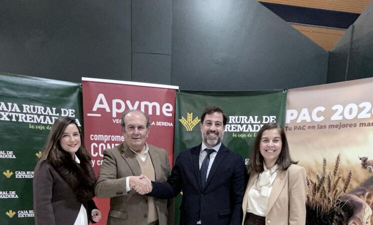 El presidente de Caja Rural de Extremadura, Urbano Caballo, y el presidente de la Asociación de la Pequeña y Mediana Empresa Vegas Altas-La Serena (Apyme), Javier Dorado, han renovado este viernes el convenio de colaboración que ambas entidades mantienen para el impulso del tejido empresarial de las comarcas de Vegas Altas y La Serena.