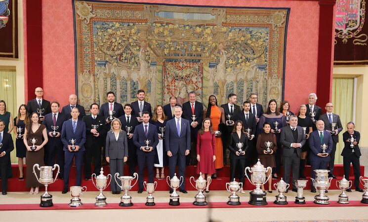 Los futbolistas Rodrigo Hernández y Aitana Bonmatí y los marchadores Álvaro Martín y María Pérez han recibido este miércoles los Premios Nacionales del Deporte de 2023 y 2024, respectivamente, en una ceremonia presidida por SS. MM. los Reyes en el Palacio Real de El Pardo (Madrid) y por la ministra de Educación, Formación Profesional y Deportes, Milagros Tolón.
