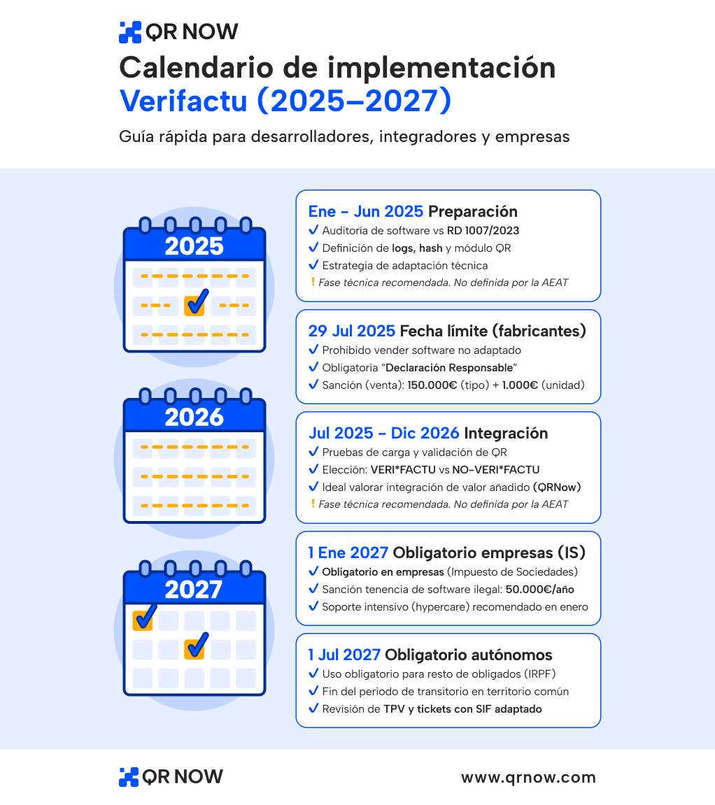 Para clarificar este desfase, portales especializados como QRNow cuentan con un calendario de implementación que grafica bien la puesta en marcha escalonada, diferenciando entre el periodo de puesta en marcha para los desarrolladores y el inicio de uso obligatorio para los contribuyentes.