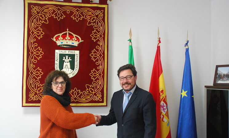 El director de Telefónica en Extremadura, Guillermo Santamaría, ha presentado a la alcaldesa de Valencia del Ventoso, María Concepción López, el desarrollo del despliegue de la red de fibra óptica FTTH de Movistar en esta localidad.