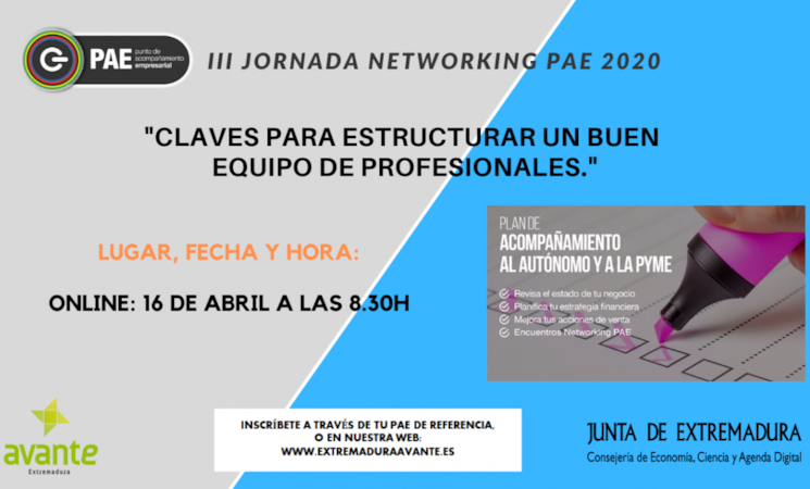 Así pues, según informa la Junta en una nota de prensa, desde la red de Puntos de Acompañamiento Empresarial de Extremadura continúa la celebración de los encuentros Networking PAE en el marco del Plan de Acompañamiento y Seguimiento al Autónomo y la Pyme, y en esta ocasión las sesiones se impartirán en formato virtual debido a la situación actual provocada por el Covid-19.