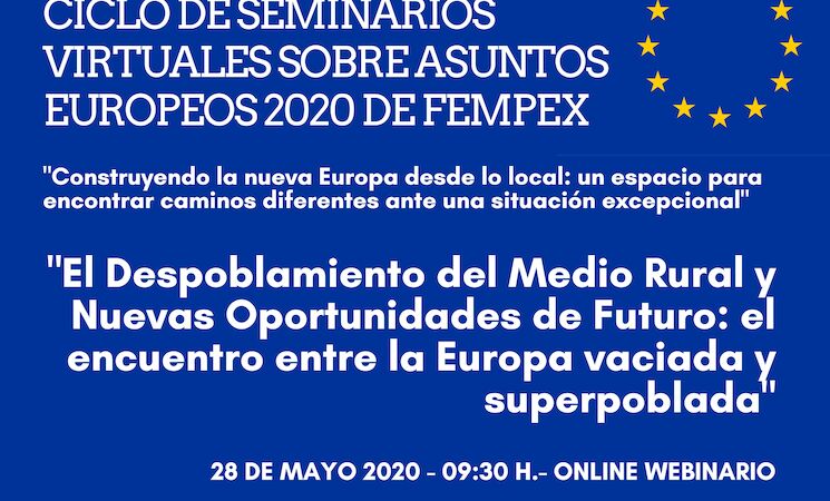 La Federación de Municipios y Provincias de Extremadura (Fempex), en colaboración con las diputaciones de Cáceres y Badajoz, ha puesto en marcha un ciclo de seis seminarios virtuales para avanzar en la construcción de Europa "desde lo local" que se desarrollará entre el 28 de mayo y el 2 de julio, todos los jueves, en horario de 09:30 a 11:30 horas.