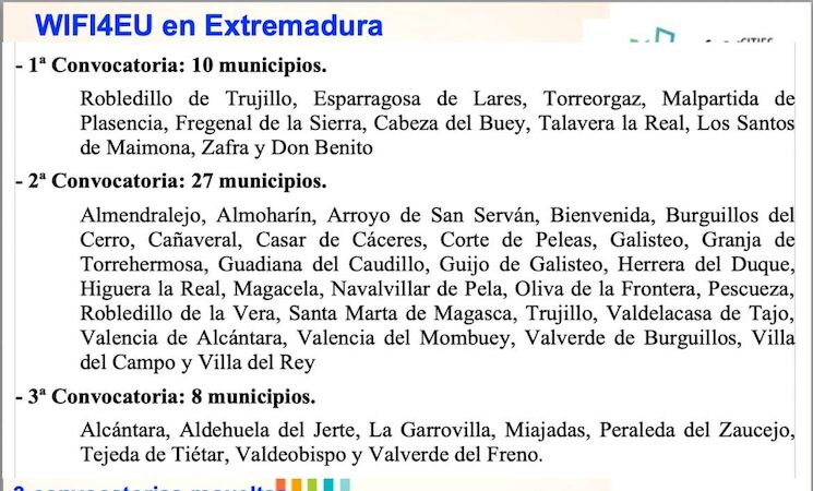 Por último, a la tercera de las convocatorias realizadas hasta la fecha accedieron otros ocho municipios extremeños, que son Alcántara. Aldehuela de Jerte, La Garrovilla, Miajadas, Peraleda del Zaucejo, Tejada de Tiétar, Valdeobispo y Valverde del Fresno.