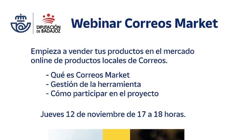 La Diputación de Badajoz ha organizado para este jueves, 12 de noviembre, un webinar dirigido a productores locales de la provincia de Badajoz, cuyo objetivo es fomentar y enseñar el funcionamiento y las posibilidades de Correos Market, una plataforma de venta online de productos locales impulsada por la Sociedad Estatal de Correos.