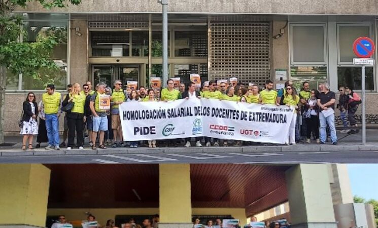 Representantes sindicales de PIDE, CSIF, ANPE, CCOO y UGT se han concentrado este miércoles frente a las Delegaciones Provinciales de Educación en Badajoz y Cáceres para pedir la homologación salarial de los docentes con el resto de las Comunidades Autónomas (CCAA), ya que Extremadura es "la segunda por la cola" en cuanto a retribuciones del personal docente.