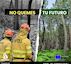 Así pues, tomando como referencia el soporte principal del cartel, la campaña muestra una contraposición entre un pinar verde y un paisaje quemado. En una de las imágenes, se muestra un paisaje desolador en el que dos bomberos forestales trabajan en la extinción de los últimos rescoldos que han dejado las llamas, y en la otra una frondosa estampa de pinos y helechos verdes.