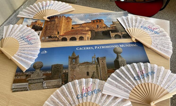 La Oficina Municipal de Turismo del Ayuntamiento de Cáceres ha comenzado a repartir los abanicos que han sido fabricados por una empresa local en madera y tela, llevan impreso el nuevo logotipo de 'Feel Cáceres' sobre un fondo con el plano del conjunto monumental.