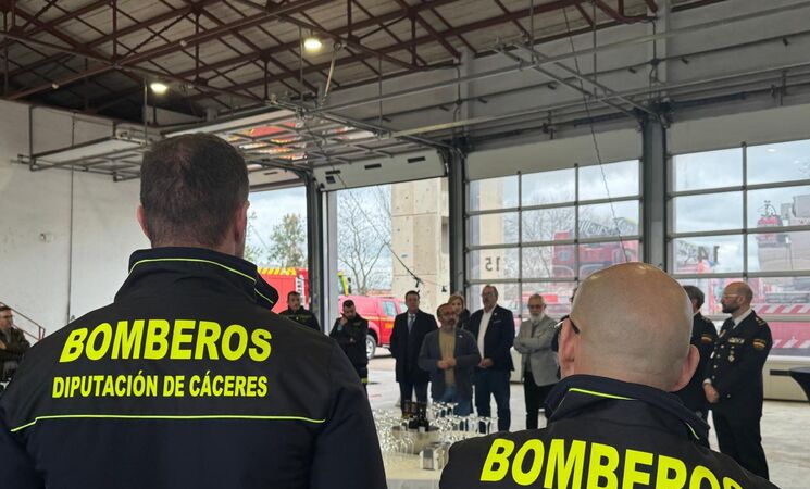 El presidente de la Diputación de Cáceres, Miguel Ángel Morales, junto al diputado de Recursos Humanos y Sepei, Alberto Ortega Villarroel, y diputados y diputadas provinciales han acompañado este lunes al cuerpo de bomberos del parque del Sepei en Cáceres, en el acto de celebración de su patrón, san Juan de Dios.