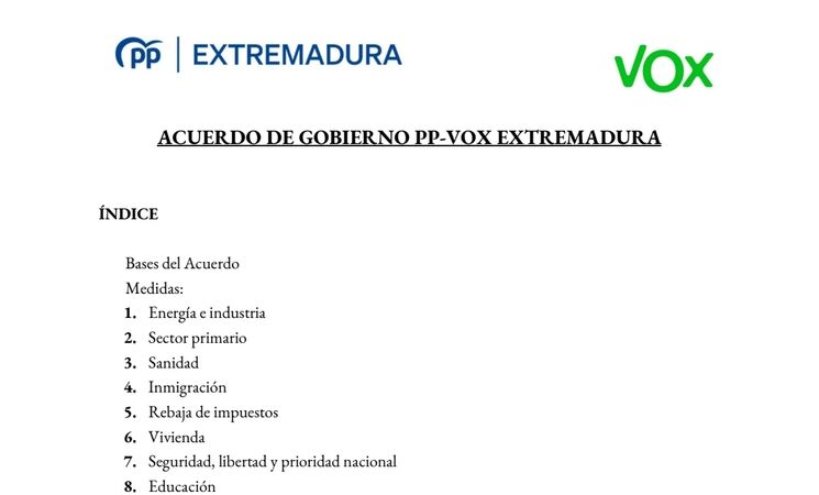 Un acuerdo de 23 páginas que han firmado los responsables del PP y de Vox en Extremadura, por el que ambos partidos acuerdan constituir "un Gobierno de coalición único, con pleno respeto a la jerarquía y competencias de sus miembros".